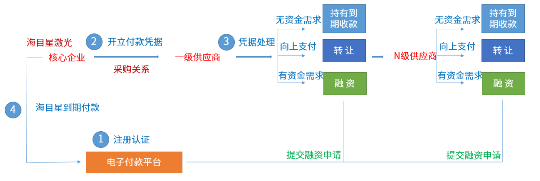 “星鏈”是由海目星激光在海目星激光供應鏈金融平臺上以電子簽名形式簽發(fā)的,承諾在到期日支付確定金額貨款給供應商的數(shù)字債權憑證,該電子債權憑證支持線上無限次拆分、無限次轉讓和按需融資。