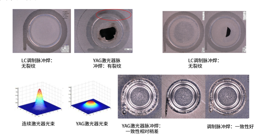 激光LC焊接技術,依托本公司自主研發的激光器可以對激光能量進行不同的調制,可實現連續光能量波形調制,使其可以進行連續焊接,同時也可以使其轉化為頻率可調、峰值可調、出光時間和出光間隔可調的類脈沖激光,可以進行脈沖焊接。有效的解決了連續激光器針孔多,脈沖激光器容易斷裂和速度低的問題。打破了傳統YAG焊接頻率和功率相互受限制無法提速的現象,在較大纖徑下頻率提升實現脈沖提速焊接。